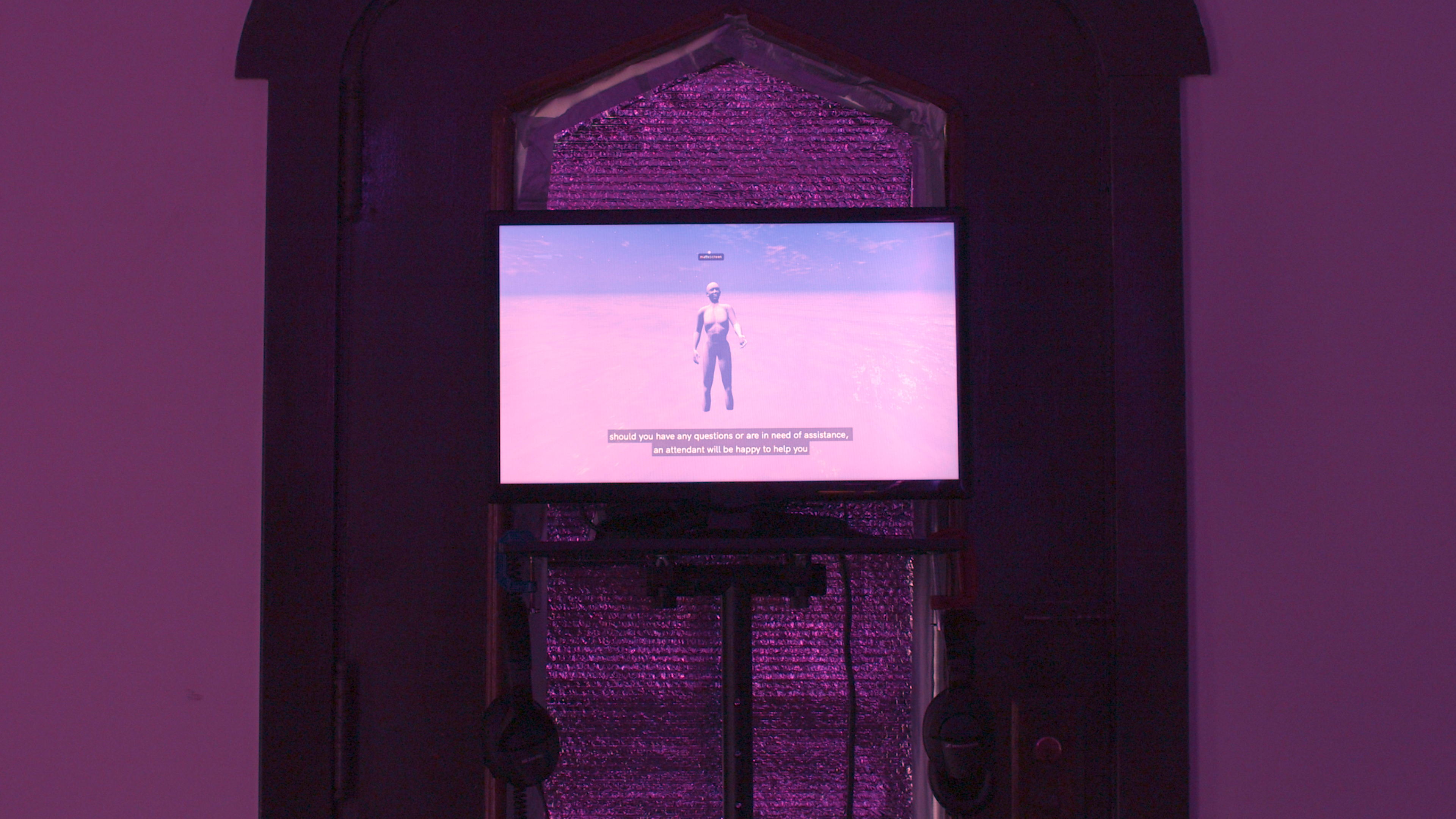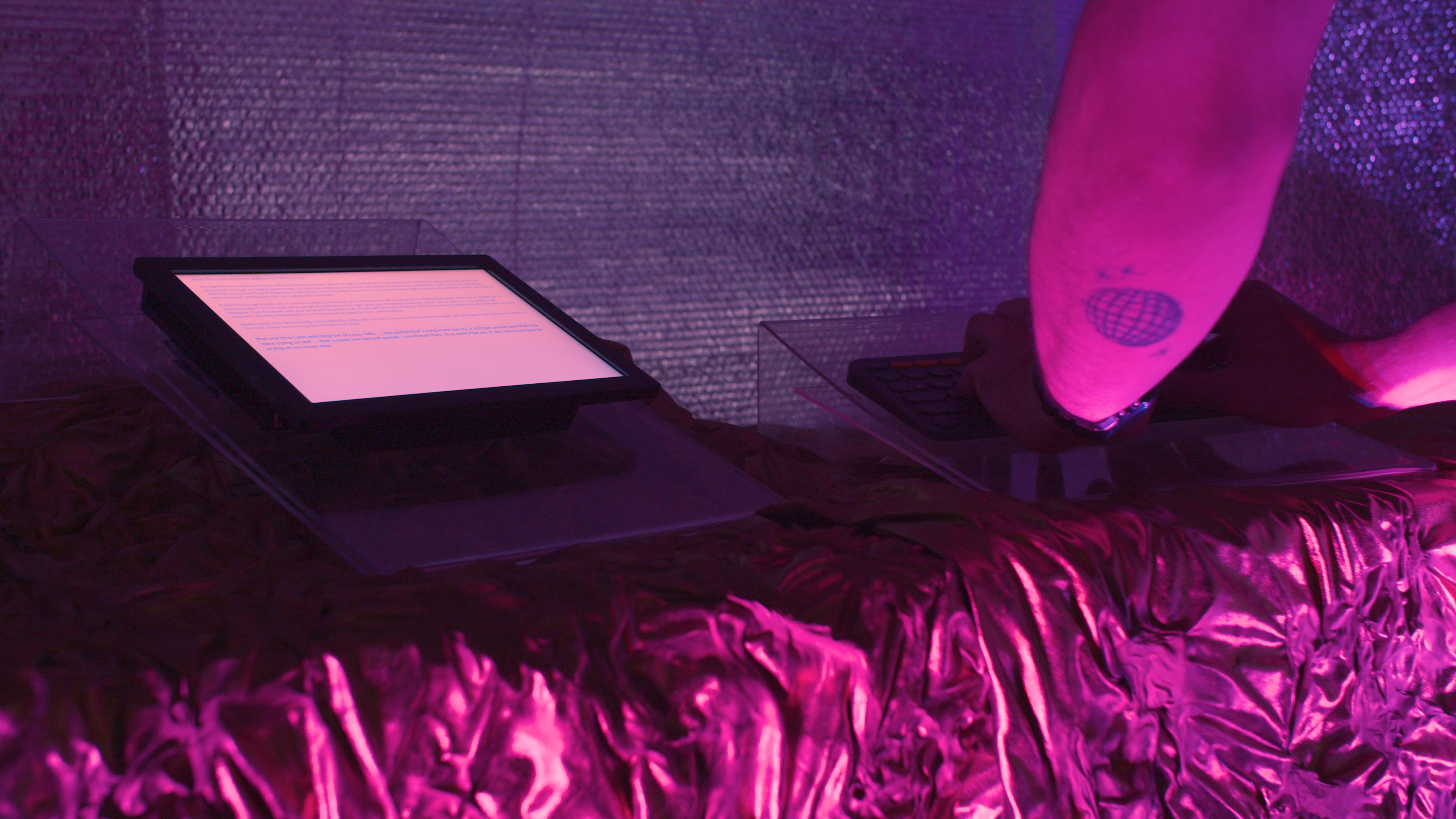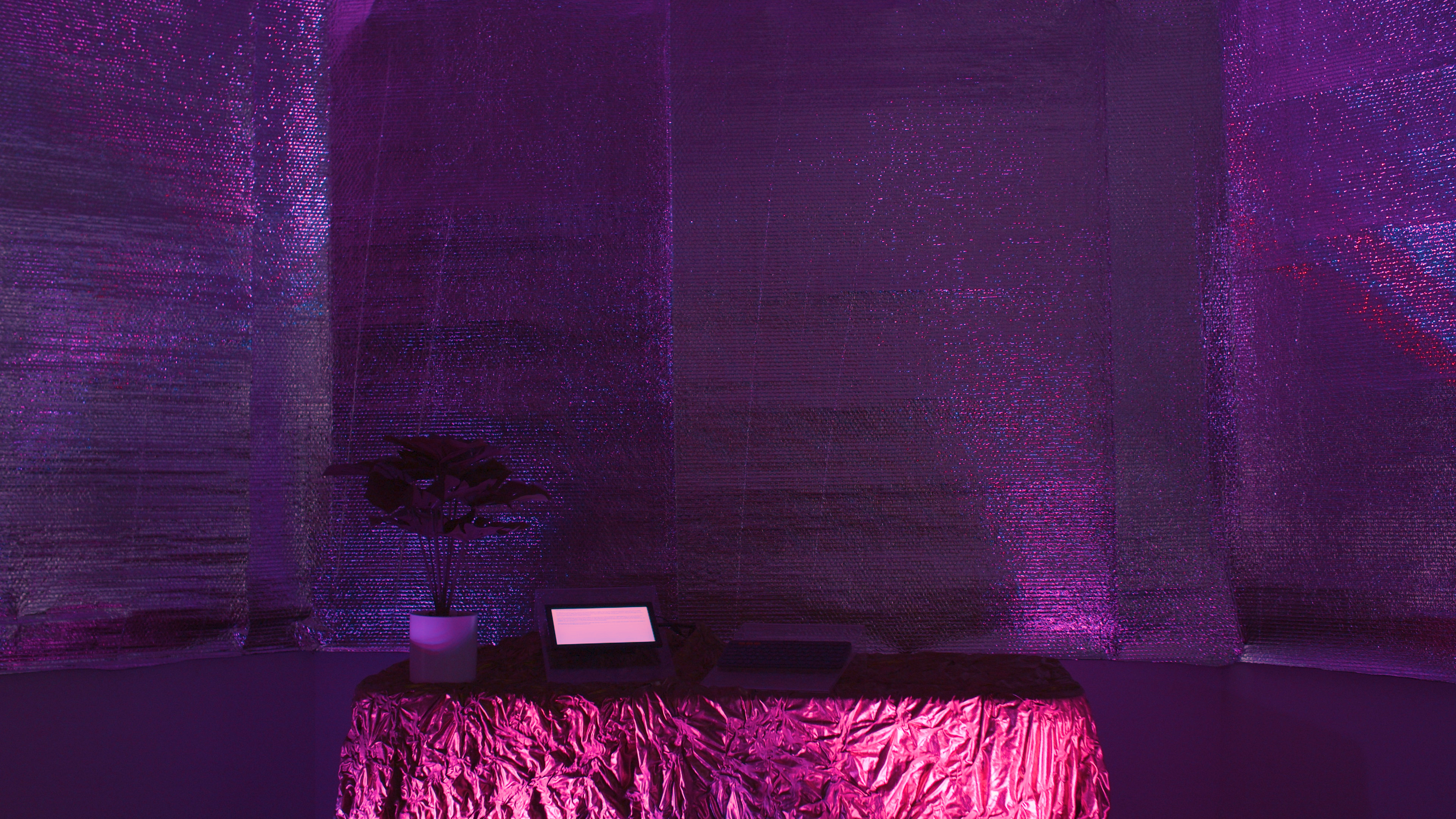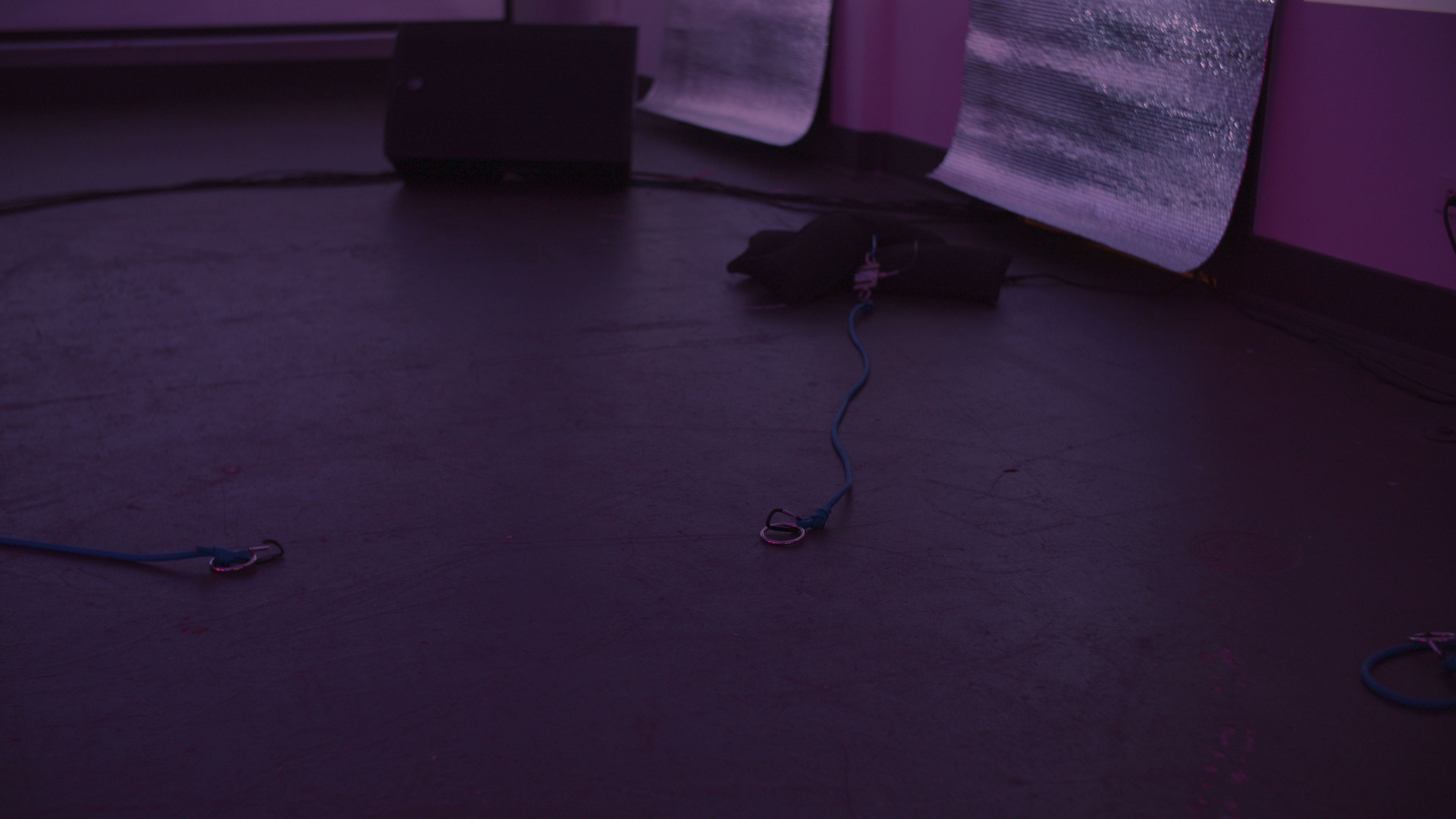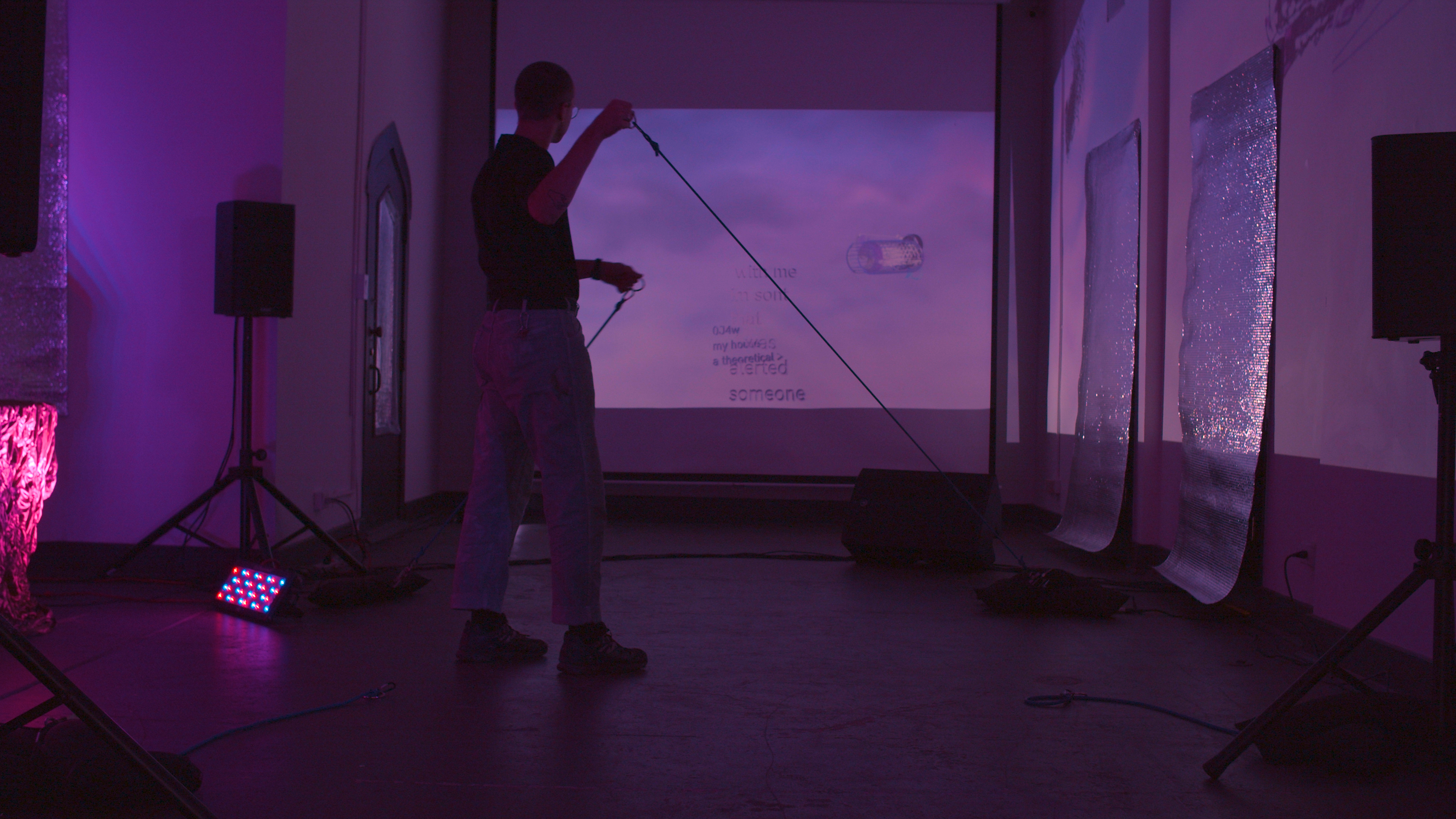 SENTICS 2.0 is a process and a processing, an event for re/collection, de/encryption, and re/incorporation of the complex emotional scripts and memories from our digital experience. The event is facilitated by chris wood’s performance avatar, matte_screen, who demonstrates how to engage and embody the potential of our avatar’s emotions. Memories typed and submitted by the audience are live-encrypted, visualized, and projected into a virtual memorial space, and somatic engagement with elastic bands throughout the space affects the sound felt in the room and the gravity felt in the body. Comfort Station's interior becomes an imaginary AFK social media instance - generating space for digital-self-cultivation, through queer blurring of the ‘virtual’ and the ‘actual’, practiced attunement to communal processing, and a generous embrace of the integrity of the avatar.